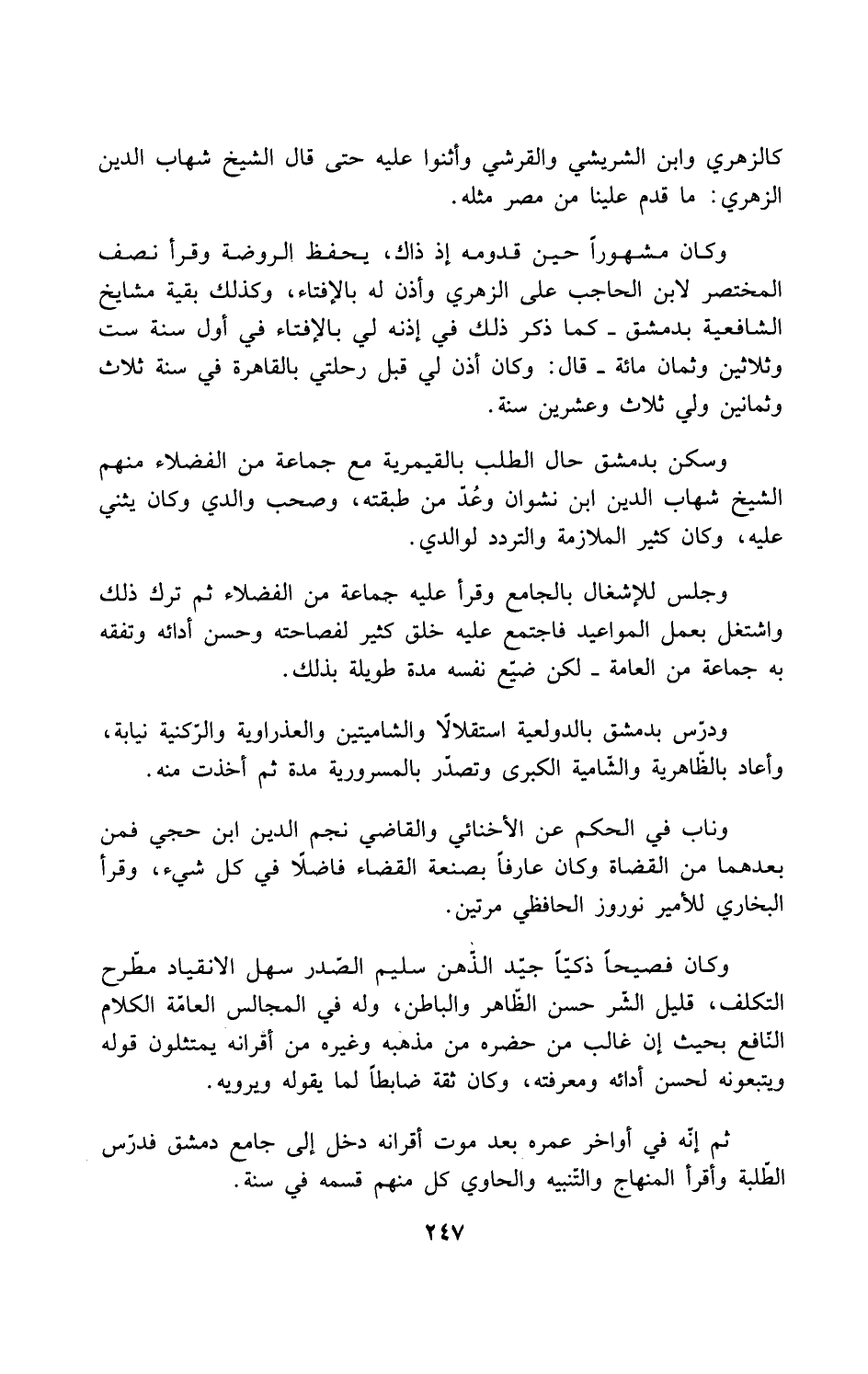 كالزهري وابن الشريشي والقرشي وأثنوا عليه حتى قال الشيخ شهاب الدين الزهري: ما قدم علينا من مصر مثله.