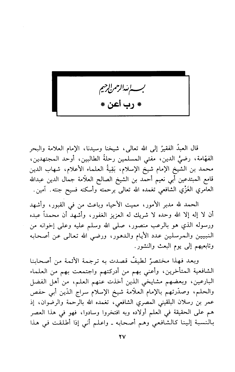 قال العبدُ الفقيرُ إلى الله تعالى، شيخنا وسيدنا، الإمام العلامة والبحر الفهّامة، رضيُّ الدين، مفتي المسلمين رحلةُ الطالبين، أوحد المجتهدين، محمد بن الشيخ الإمام شيخ الإسلام، بَقِيةُ العلماء الأعلام، شهاب الدين قامع المبتدعين أبي نعيم أحمد بن الشيخ الصالح العلّامة جمال الدين عبد الله العامري الغَزِّي الشافعي تغمده الله تعالى برحمته وأسكنه فسيح جنته. آمين.