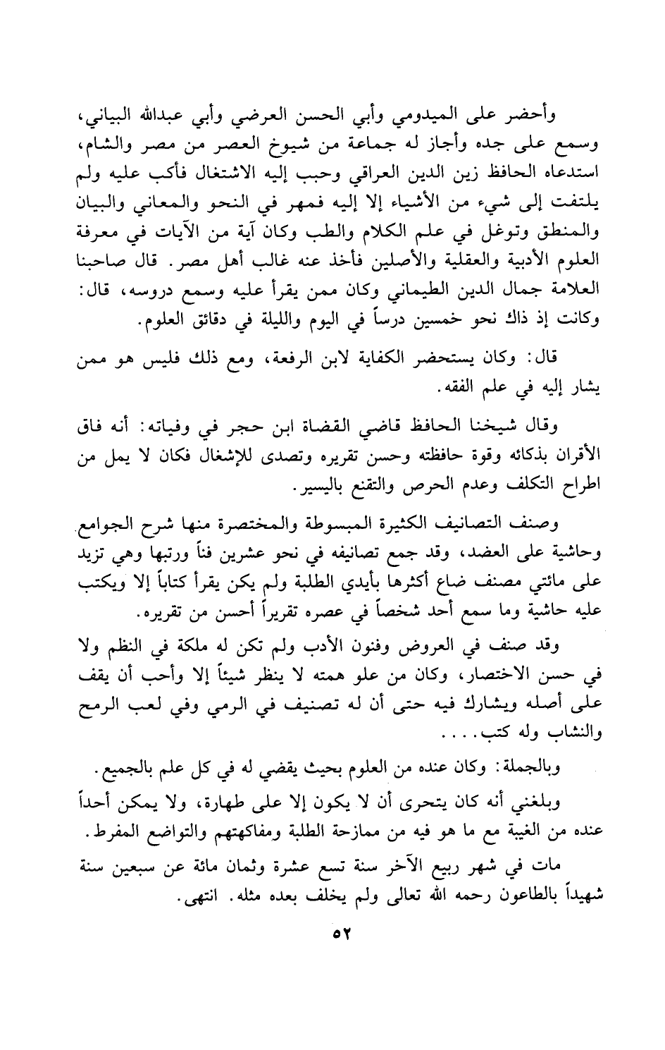 وقال شيخنا الحافظ قاضي القضاة ابن حجر في وفياته: أنه فاق الأقران بذكائه وقوة حافظته وحسن تقريره وتصدى للإشغال فكان لا يمل من اطراح التكلف وعدم الحرص والتقنع باليسير.