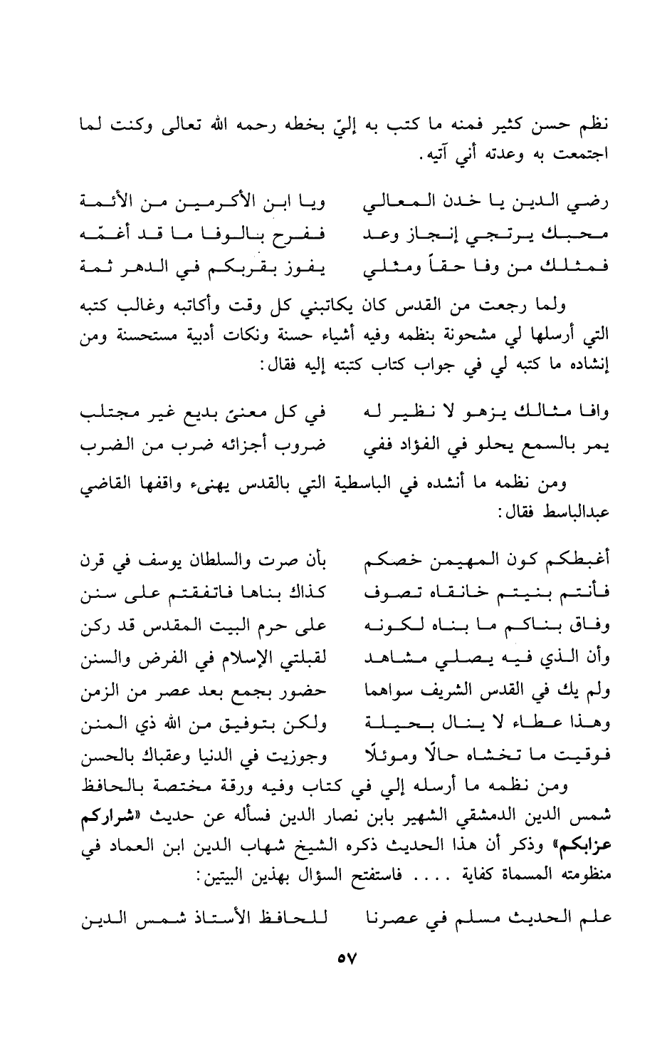 ولما رجعت من القدس كان يكاتبني كل وقت وأكاتبه وغالب كتبه التي أرسلها لي مشحونة بنظمه وفيه أشياء حسنة ونكات أدبية مستحسنة ومن إنشاده ما كتبه لي في جواب كتاب كتبته إليه فقال: