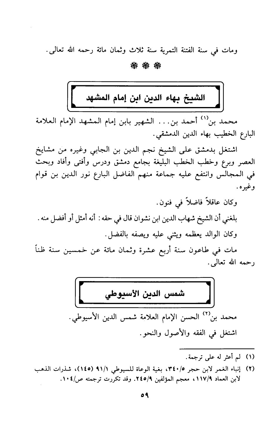 (¬2) إنباء الغمر لابن حجر 5/ 340، بغية الوعاة للسيوطي 1/ 91 (145)، شذرات الذهب لابن العماد 9/ 117، معجم المؤلفين 9/ 245. وقد تكررت ترجمته ص/104.