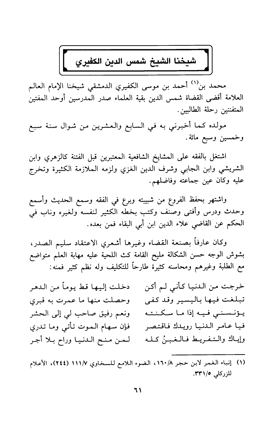 محمد بن (¬1) أحمد بن موسى الكفيري الدمشقي شيخنا الإمام العالم العلامة أقضى القضاة شمس الدين بقية العلماء صدر المدرسين أوحد المفتين المتفننين رحلة الطالبين.