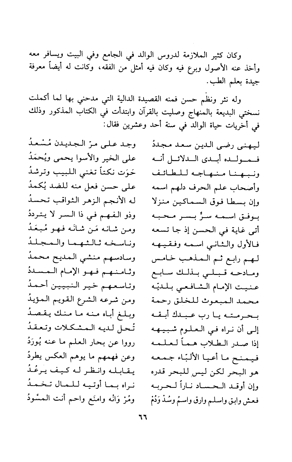 وله نثر ونظم حسن فمنه القصيدة الدالية التي مدحني بها لما أكملت نسختي البديعة بالمنهاج وصليت بالقرآن وابتدأت في الكتاب المذكور وذلك في أخريات حياة الوالد في سنة أحد وعشرين فقال: