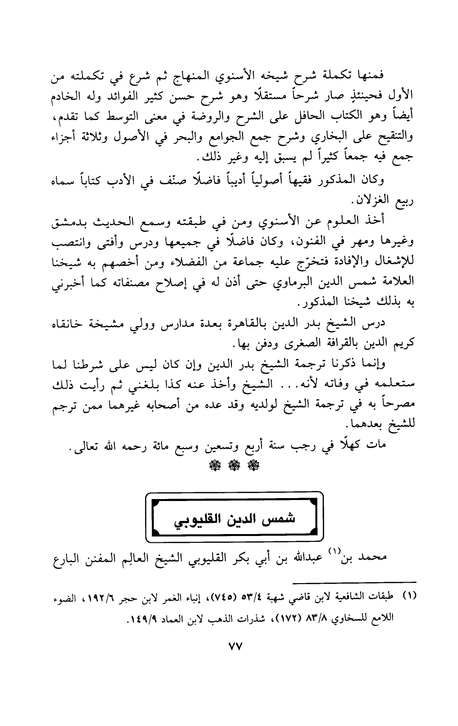 وإنما ذكرنا ترجمة الشيخ بدر الدين وإن كان ليس على شرطنا لما ستعلمه في وفاته لأنه. . . الشيخ وأخذ عنه كذا بلغني ثم رأيت ذلك مصرحاً به في ترجمة الشيخ لولديه وقد عده من أصحابه غيرهما ممن ترجم للشيخ بعدهما.