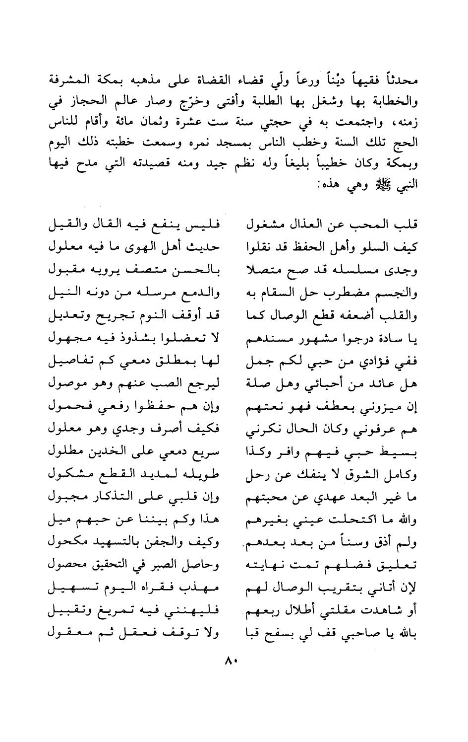 محدثاً فقيهاً ديِّناً ورعاً ولّي قضاء القضاة على مذهبه بمكة المشرفة والخطابة بها وشغل بها الطلبة وأفتى وخرّج وصار عالم الحجاز في زمنه، واجتمعت به في حجتي سنة ست عشرة وثمان مائة وأقام للناس الحج تلك السنة وخطب الناس بمسجد نمره وسمعت خطبته ذلك اليوم وبمكة وكان خطيباً بليغاً وله نظم جيد ومنه قصيدته التي مدح فيها النبي - صلى الله عليه وسلم - وهي هذه: