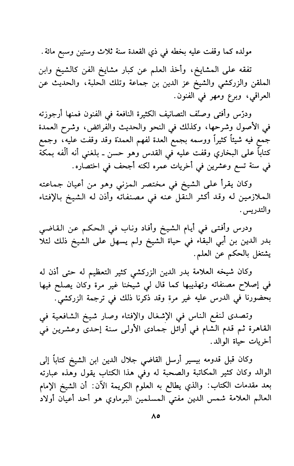 وكان قبل قدومه بيسير أرسل القاضي جلال الدين ابن الشيخ كتاباً إلى الوالد وكان كثير المكاتبة والصحبة له وفي هذا الكتاب يقول وهذه عبارته بعد مقدمات الكتاب: والذي يطالع به العلوم الكريمة الآن: أن الشيخ الإمام العالم العلامة شمس الدين مفتي المسلمين البرماوي هو أحد أعيان أولاد