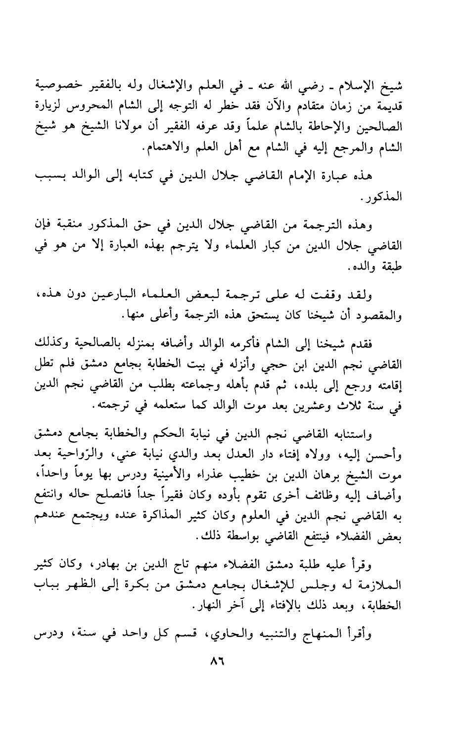 شيخ الإسلام -رضي الله عنه- في العلم والإشغال وله بالفقير خصوصية قديمة من زمان متقادم والآن فقد خطر له التوجه إلى الشام المحروس لزيارة الصالحين والإحاطة بالشام علماً وقد عرفه الفقير أن مولانا الشيخ هو شيخ الشام والمرجع إليه في الشام مع أهل العلم والاهتمام.