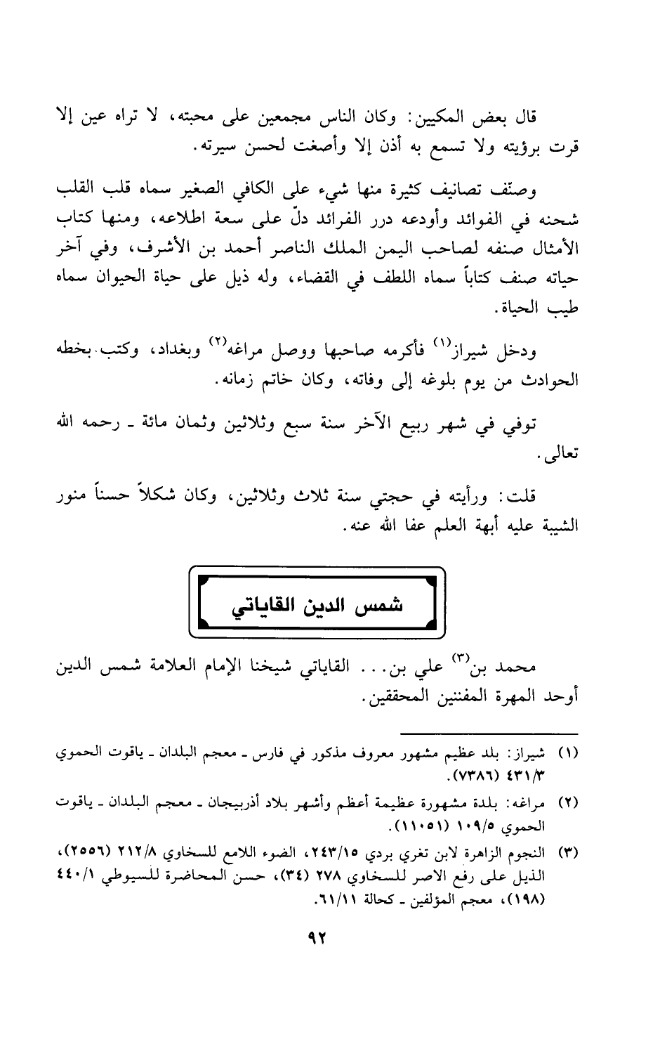محمد بن (¬3) علي بن. . . القاياتي شيخنا الإمام العلامة شمس الدين أوحد المهرة المفننين المحققين.