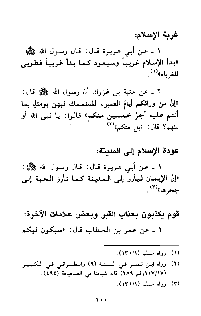 1- عن أبي هريرة قال: قال رسول الله - صلى الله عليه وسلم -: ((بدأ الإسلام غريباً وسيعود كما بدأ غريباً فطوبى للغرباء)) (¬1) .