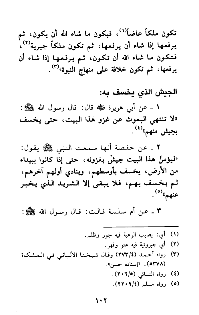 1- عن أبي هريرة - رضي الله عنه - قال: قال رسول الله - صلى الله عليه وسلم -: ((لا تنتهي البعوث عن غزو هذا البيت، حتى يخسف بجيش منهم)) (¬4) .