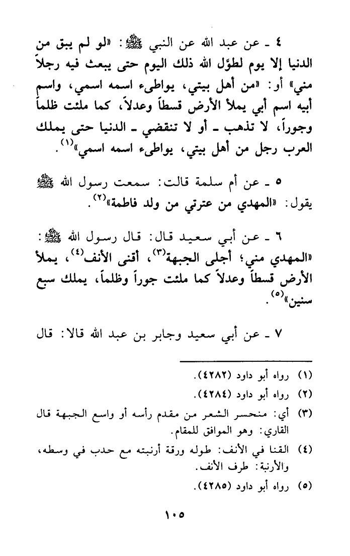 4- عن عبد الله عن النبي - صلى الله عليه وسلم -: ((لو لم يبق من الدنيا إلا يوم لطوَّل الله ذلك اليوم حتى يبعث فيه رجلاً مني)) أو: ((من أهل بيتي، يواطىء اسمه اسمي، واسم أبيه اسم أبي يملأ الأرض قسطاً وعدلاً، كما ملئت ظلماً وجوراً، لا تذهب - أو لا تنقضي - الدنيا حتى يملك العرب رجل من أهل بيتي، يواطىء اسمه اسمي)) (¬1) .