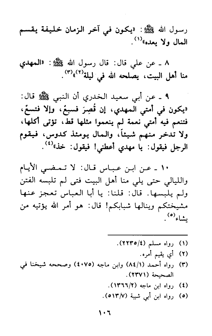 9- عن أبي سعيد الخدري أن النبي - صلى الله عليه وسلم - قال: ((يكون في أمتي المهدي، إن قُصِرَ فسبعٌ، وإلا فتسعٌ، فتنعم فيه أمتي نعمة لم ينعموا مثلها قط، تؤتى أكلها، ولا تدخر منهم شيئاً، والمال يومئذ كدوس، فيقوم الرجل فيقول: يا مهدي أعطني! فيقول: خذ)) (¬4) .