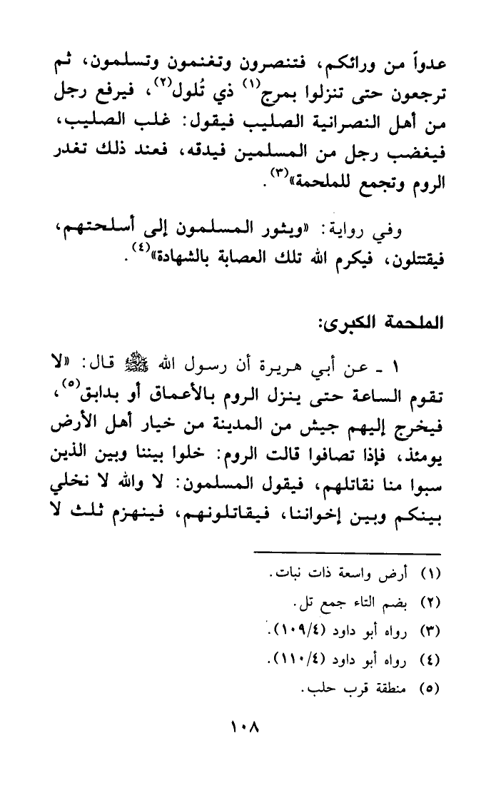 1- عن أبي هريرة أن رسول الله - صلى الله عليه وسلم - قال: ((لا تقوم الساعة حتى ينزل الروم بالأعماق أو بدابق (¬5) ، فيخرج إليهم جيش من المدينة من خيار أهل الأرض يومئذ، فإذا تصافوا قالت الروم: خلوا بيننا وبين الذين سبوا منا نقاتلهم، فيقول المسلمون: لا والله لا نخلي بينكم وبين إخواننا، فيقاتلونهم، فينهزم ثلث لا