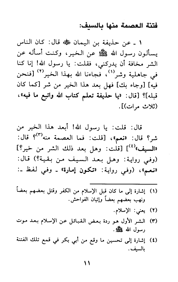 1- عن حذيفة بن اليمان - رضي الله عنه - قال: كان الناس يسألون رسول الله - صلى الله عليه وسلم - عن الخير، وكنت أسأله عن الشر مخافة أن يدركني، فقلت: يا رسول الله! إنا كنا في جاهلية وشر (¬1) ، فجاءنا الله بهذا الخير (¬2) [فنحن فيه] [وجاء بك] فهل بعد هذا الخير من شر [كما كان قبله] ؟ [قال: يا حذيفة تعلم كتاب الله واتبع ما فيه، (ثلاث مرات) ] قال: قلت: يا رسول الله! أبعد هذا الخير من شر؟ قال: نعم، [قلت: فما العصمة منه (¬3) ؟ قال: السيف (¬4) ] [قلت: وهل بعد ذلك الشر من خير؟] (وفي رواية: وهل بعد السيف من بقية؟) قال: نعم، (وفي رواية: تكون إمارة - وفي لفظ -