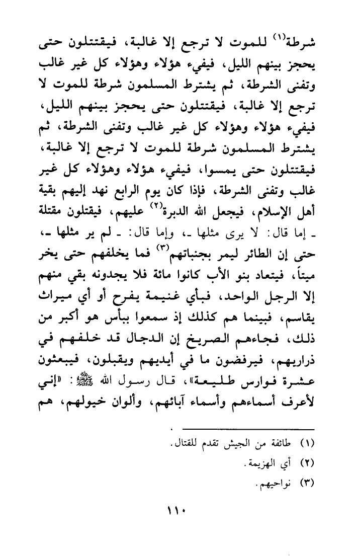 شرطة (¬1) للموت لا ترجع إلا غالبة، فيقتتلون حتى يحجز بينهم الليل، فيفيء هؤلاء وهؤلاء كل غير غالب وتفنى الشرطة، ثم يشترط المسلمون شرطة للموت لا ترجع إلا غالبة، فيقتتلون حتى يحجز بينهم الليل، فيفيء هؤلاء وهؤلاء كل غير غالب وتفنى الشرطة، ثم يشترط المسلمون شرطة للموت لا ترجع إلا غالبة، فيقتتلون حتى يمسوا، فيفيء هؤلاء وهؤلاء كل غير غالب وتفنى الشرطة، فإذا كان يوم الرابع نهد إليهم بقية أهل الإسلام، فيجعل الله الدبرة (¬2) عليهم، فيقتلون مقتلة إما قال: لا يرى مثلها، وإما قال: لم ير مثلها، حتى إن الطائر ليمر بجنباتهم (¬3) فما يخلفهم حتى يخر ميتاً، فيتعاد بنو الأب كانوا مائة فلا يجدونه بقي منهم إلا الرجل الواحد، فبأي غنيمة يفرح أو أي ميراث يقاسم، فبينما هم كذلك إذ سمعوا ببأس هو أكبر من ذلك، فجاءهم الصريخ إن الدجال قد خلفهم في ذراريهم، فيرفضون ما في أيديهم ويقبلون، فيبعثون عشرة فوارس طليعة، قال رسول الله - صلى الله عليه وسلم -: إني لأعرف أسماءهم وأسماء آبائهم، وألوان خيولهم، هم