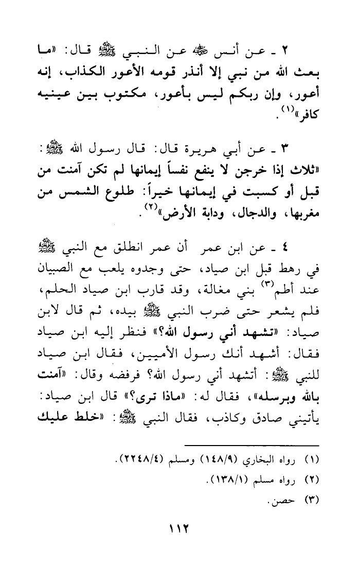 3-عن أبي هريرة قال: قال رسول الله - صلى الله عليه وسلم -: ((ثلاث إذا خرجن لا ينفع نفساً إيمانها لم تكن آمنت من قبل أو كسبت في إيمانها خيراً: طلوع الشمس من مغربها، والدجال، ودابة الأرض)) (¬2) .
