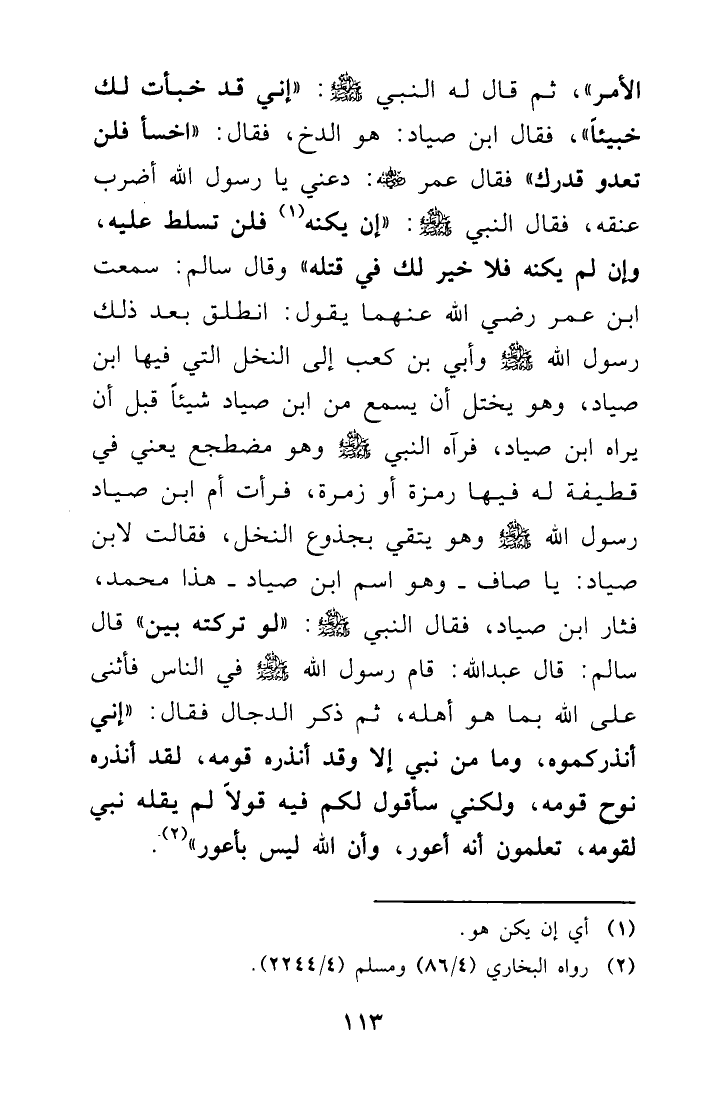 الأمر، ثم قال له النبي - صلى الله عليه وسلم -: إني قد خبأت لك خبيئاً، فقال ابن صياد: هو الدخ، فقال: اخسأ فلن تعدو قدرك)) فقال عمر - رضي الله عنه -: دعني يا رسول الله أضرب عنقه، فقال النبي - صلى الله عليه وسلم -: ((إن يكنه (¬1) فلن تسلط عليه، وإن لم يكنه فلا خير لك في قتله)) وقال سالم: سمعت ابن عمر رضي الله عنهما يقول: انطلق بعد ذلك رسول الله - صلى الله عليه وسلم - وأبي بن كعب إلى النخل التي فيها ابن صياد، وهو يختل أن يسمع من ابن صياد شيئاً قبل أن يراه ابن صياد، فرآه النبي - صلى الله عليه وسلم - وهو مضطجع يعني في قطيفة له فيها رمزة أو زمرة، فرأت أم ابن صياد رسول الله - صلى الله عليه وسلم - وهو يتقي بجذوع النخل، فقالت لابن صياد: يا صاف - وهو اسم ابن صياد - هذا محمد، فثار ابن صياد، فقال النبي - صلى الله عليه وسلم -: ((لو تركته بين)) قال سالم: قال عبد الله: قام رسول الله - صلى الله عليه وسلم - في الناس فأثنى على الله بما هو أهله، ثم ذكر الدجال فقال: ((إني أنذركموه، وما من نبي إلا وقد أنذره قومه، لقد أنذره نوح قومه، ولكني سأقول لكم فيه قولاً لم يقله نبي لقومه، تعلمون أنه أعور، وأن الله ليس بأعور)) (¬2)