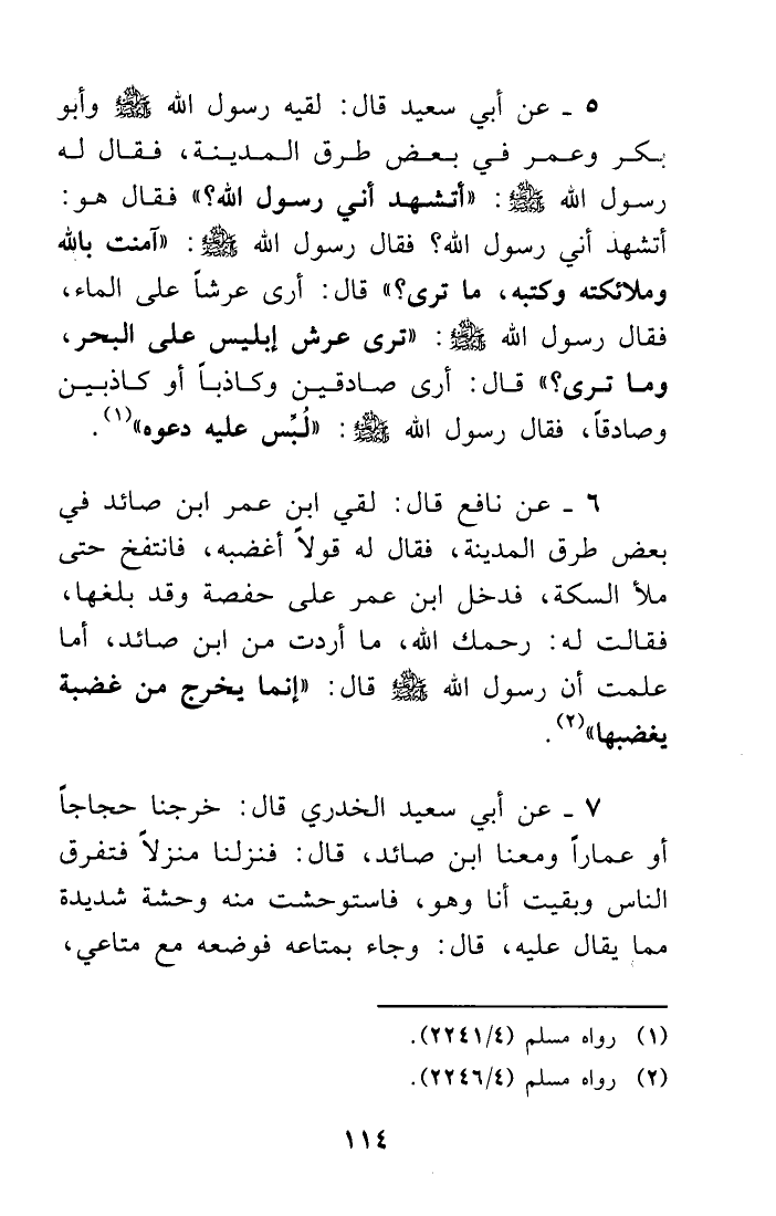 5- عن أبي سعيد قال: لقيه رسول الله - صلى الله عليه وسلم - وأبو بكر وعمر في بعض طرق المدينة، فقال له رسول الله - صلى الله عليه وسلم -: ((أتشهد أني رسول الله؟ فقال هو: أتشهد أني رسول الله؟ فقال رسول الله - صلى الله عليه وسلم -: آمنت بالله وملائكته وكتبه، ما ترى؟ قال: أرى عرشاً على الماء، فقال رسول الله - صلى الله عليه وسلم -: ترى عرش إبليس على البحر، وما ترى؟ قال: أرى صادقين وكاذباً أو كاذبين وصادقاً، فقال رسول الله - صلى الله عليه وسلم -: لبس عليه دعوه)) (¬1) .