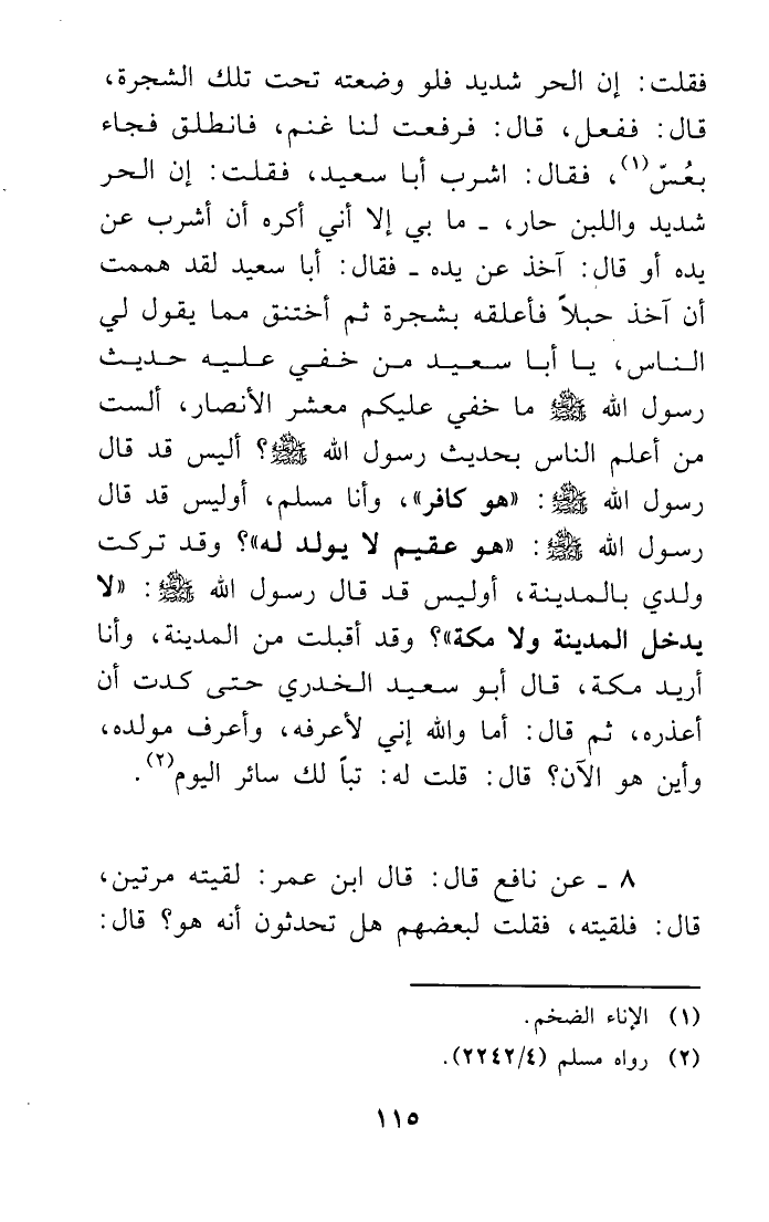 فقلت: إن الحر شديد فلو وضعته تحت تلك الشجرة، قال: ففعل، قال: فرفعت لنا غنم، فانطلق فجاء بعُسّ (¬1) ، فقال: اشرب أبا سعيد، فقلت: إن الحر شديد واللبن حار، - ما بي إلا أني أكره أن أشرب عن يده أو قال: آخذ عن يده - فقال: أبا سعيد لقد هممت أن آخذ حبلاً فأعلقه بشجرة ثم أختنق مما يقول لي الناس، يا أبا سعيد من خفي عليه حديث رسول الله - صلى الله عليه وسلم - ما خفي عليكم معشر الأنصار، ألست من أعلم الناس بحديث رسول الله - صلى الله عليه وسلم -؟ أليس قد قال رسول الله - صلى الله عليه وسلم -: ((هو كافر)) ، وأنا مسلم، أوليس قد قال رسول الله - صلى الله عليه وسلم -: ((هو عقيم لا يولد له)) ؟ وقد تركت ولدي بالمدينة، أوليس قد قال رسول الله - صلى الله عليه وسلم -: ((لا يدخل المدينة ولا مكة)) ؟ وقد أقبلت من المدينة، وأنا أريد مكة، قال أبو سعيد الخدري حتى كدت أن أعذره، ثم قال: أما والله إني لأعرفه، وأعرف مولده، وأين هو الآن؟ قال: قلت له: تباً لك سائر اليوم)) (¬2) .