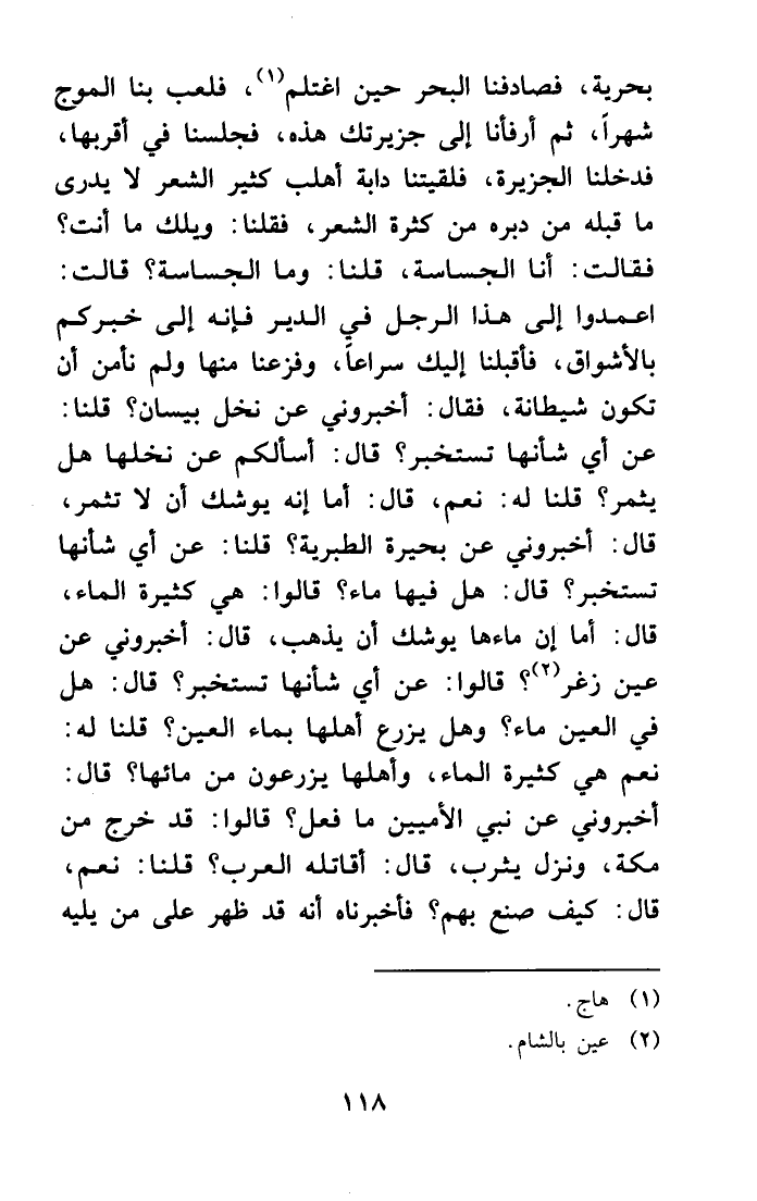 منها ولم نأمن أن تكون شيطانة، فقال: أخبروني عن نخل بيسان؟ قلنا: عن أي شأنها تستخبر؟ قال: أسألكم عن نخلها هل يثمر؟ قلنا له: نعم، قال: أما إنه يوشك أن لا تثمر، قال: أخبروني عن بحيرة الطبرية؟ قلنا: عن أي شأنها تستخبر؟ قال: هل فيها ماء؟ قالوا: هي كثيرة الماء، قال: أما إن ماءها يوشك أن يذهب، قال: أخبروني عن عين زغر (¬2) ؟ قالوا: عن أي شأنها تستخبر؟ قال: هل في العين ماء؟ وهل يزرع أهلها بماء العين؟ قلنا له: نعم هي كثيرة الماء، وأهلها يزرعون من مائها؟ قال: أخبروني عن نبي الأميين ما فعل؟ قالوا: قد خرج من مكة، ونزل يثرب، قال: أقاتله العرب؟ قلنا: نعم، قال: كيف صنع بهم؟ فأخبرناه أنه قد ظهر على من يليه
