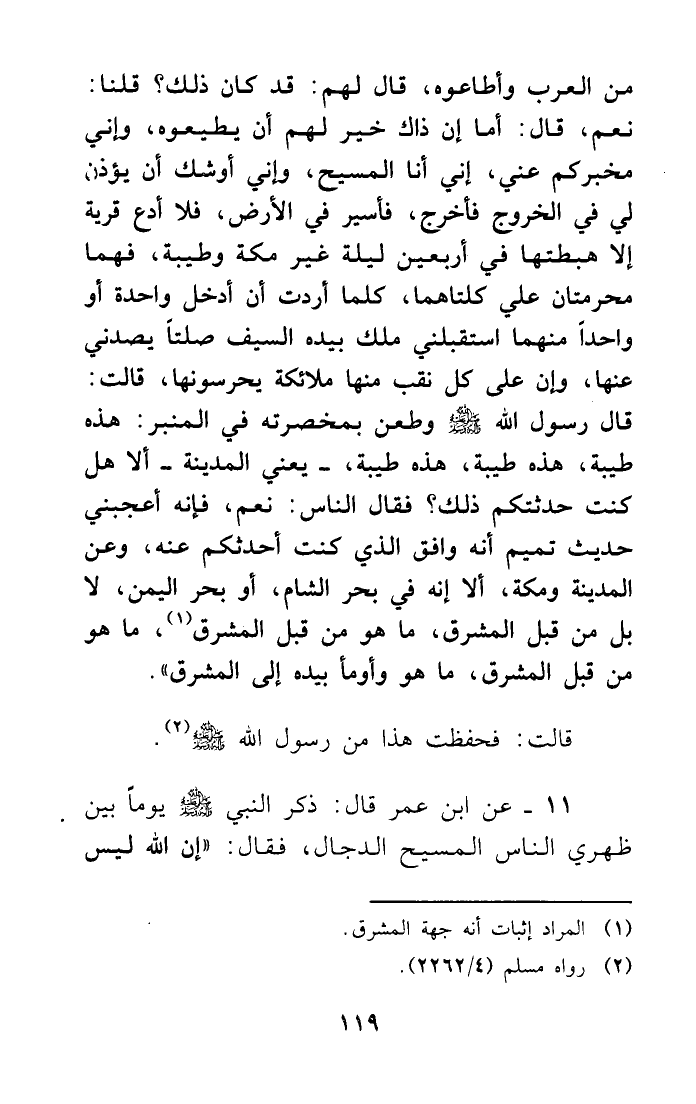 من العرب وأطاعوه، قال لهم: قد كان ذلك؟ قلنا: نعم، قال: أما إن ذاك خير لهم أن يطيعوه، وإني مخبركم عني، إني أنا المسيح، وإني أوشك أن يؤذن لي في الخروج فأخرج، فأسير في الأرض، فلا أدع قرية إلا هبطتها في أربعين ليلة غير مكة وطيبة، فهما محرمتان علي كلتاهما، كلما أردت أن أدخل واحدة أو واحداً منهما استقبلني ملك بيده السيف صلتاً يصدني عنها، وإن على كل نقب منها ملائكة يحرسونها، قالت: قال رسول الله - صلى الله عليه وسلم - وطعن بمخصرته في المنبر: هذه طيبة، هذه طيبة، هذه طيبة، - يعني المدينة - ألا هل كنت حدثتكم ذلك؟ فقال الناس: نعم، فإنه أعجبني حديث تميم أنه وافق الذي كنت أحدثكم عنه، وعن المدينة ومكة، ألا إنه في بحر الشام، أو بحر اليمن، لا بل من قبل المشرق، ما هو من قبل المشرق (¬1) ، ما هو من قبل المشرق، ما هو وأومأ بيده إلى المشرق)) ، قالت: فحفظت هذا من رسول الله - صلى الله عليه وسلم -. (¬2)