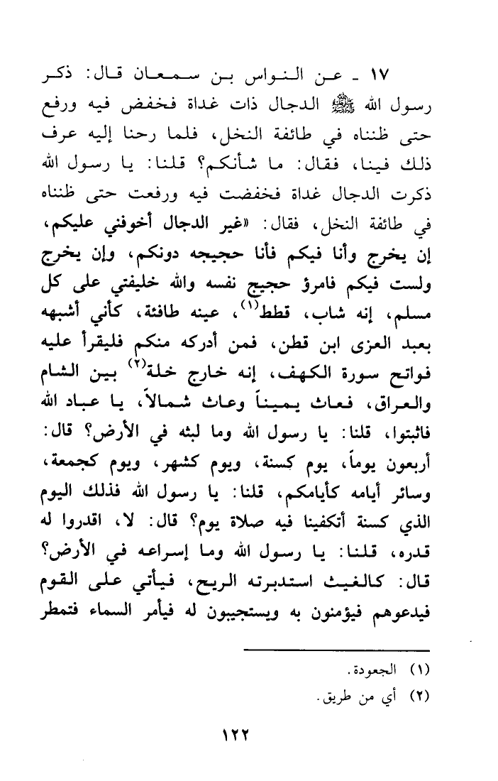 17-عن النواس بن سمعان قال: ذكر رسول الله - صلى الله عليه وسلم - الدجال ذات غداة فخفض فيه ورفع حتى ظنناه في طائفة النخل، فلما رحنا إليه عرف ذلك فينا، فقال: ما شأنكم؟ قلنا: يا رسول الله ذكرت الدجال غداة فخفضت فيه ورفعت حتى ظنناه في طائفة النخل، فقال: ((غير الدجال أخوفني عليكم، إن يخرج وأنا فيكم فأنا حجيجه دونكم، وإن يخرج ولست فيكم فامرؤ حجيج نفسه والله خليفتي على كل مسلم، إنه شاب، قطط (¬1) ، عينه طافئة، كأني أشبهه بعبد العزى بن قطن، فمن أدركه منكم فليقرأ عليه فواتح سورة الكهف، إنه خارج خلة (¬2) بين الشام والعراق، فعاث يميناً وعاث شمالاً، يا عباد الله فاثبتوا، قلنا: يا رسول الله وما لبثه في الأرض؟ قال: أربعون يوماً، يوم كسنة، ويوم كشهر، ويوم كجمعة، وسائر أيامه كأيامكم، قلنا: يا رسول الله فذلك اليوم الذي كسنة أتكفينا فيه صلاة يوم؟ قال: لا، اقدروا له قدره، قلنا: يا رسول الله وما إسراعه في الأرض؟ قال: كالغيث استدبرته الريح، فيأتي على القوم فيدعوهم فيؤمنون به ويستجيبون له فيأمر السماء فتمطر