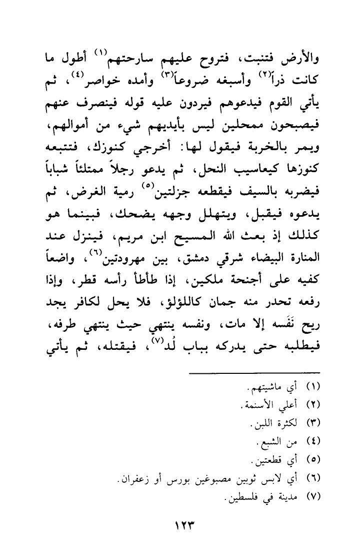 لها: أخرجي كنوزك، فتتبعه كنوزها كيعاسيب النحل، ثم يدعو رجلاً ممتلئاً شباباً فيضربه بالسيف فيقطعه جزلتين (¬5) رمية الغرض، ثم يدعوه فيقبل، ويتهلل وجهه يضحك، فبينما هو كذلك إذ بعث الله المسيح ابن مريم، فينزل عند المنارة البيضاء شرقي دمشق، بين مهرودتين (¬6) ، واضعاً كفيه على أجنحة ملكين، إذا طأطأ رأسه قطر، وإذا رفعه تحدر منه جمان كاللؤلؤ، فلا يحل لكافر يجد ريح نَفَسه إلا مات، ونفسه ينتهي حيث ينتهي طرفه، فيطلبه حتى يدركه بباب لُد (¬7) ، فيقتله، ثم يأتي