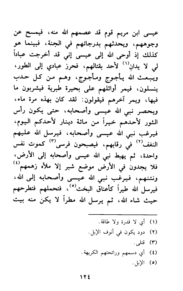 عيسى ابن مريم قوم قد عصمهم الله منه، فيمسح عن وجوههم، ويحدثهم بدرجاتهم في الجنة، فبينما هو كذلك إذ أوحى الله إلى عيسى إني قد أخرجت عباداً لي لا يدانِ (¬1) لأحد بقتالهم، فحرز عبادي إلى الطور، ويبعث الله يأجوج ومأجوج، وهم من كل حدب ينسلون، فيمر أوائلهم على بحيرة طبرية فيشربون ما فيها، ويمر آخرهم فيقولون: لقد كان بهذه مرة ماء، ويحصر نبي الله عيسى وأصحابه، حتى يكون رأس الثور لأحدهم خيراً من مائة دينار لأحدكم اليوم، فيرغب نبي الله عيسى وأصحابه، فيرسل الله عليهم النغف (¬2) في رقابهم، فيصبحون فرسى (¬3) كموت نفس واحدة، ثم يهبط نبي الله عيسى وأصحابه إلى الأرض، فلا يجدون في الأرض موضع شبر إلا ملأه زهمهم (¬4) ونتنهم، فيرغب نبي الله عيسى وأصحابه إلى الله، فيرسل الله طيراً كأعناق البخت (¬5) ، فتحملهم فتطرحهم حيث شاء الله، ثم يرسل الله مطراً لا يكن منه بيت