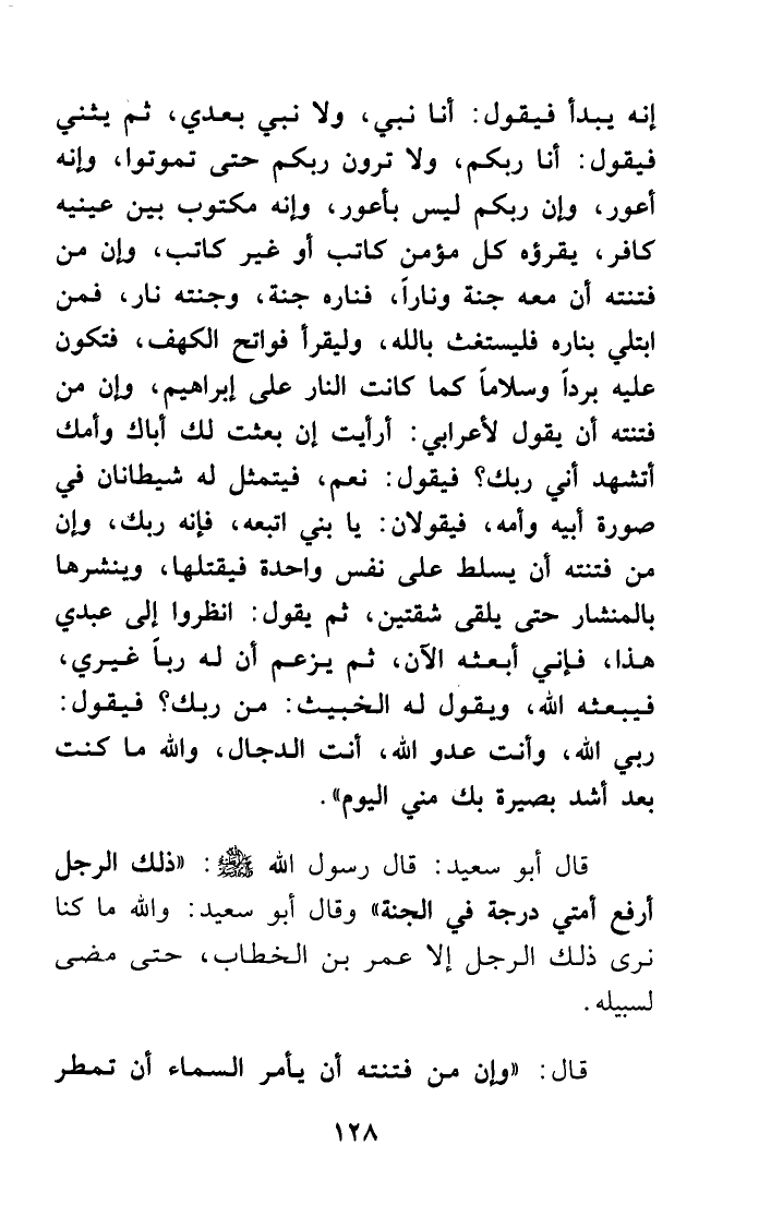 إنه يبدأ فيقول: أنا نبي، ولا نبي بعدي، ثم يثني فيقول: أنا ربكم، ولا ترون ربكم حتى تموتوا، وإنه أعور، وإن ربكم ليس بأعور، وإنه مكتوب بين عينيه كافر، يقرؤه كل مؤمن كاتب أو غير كاتب، وإن من فتنته أن معه جنة وناراً، فناره جنة، وجنته نار، فمن ابتلي بناره فليستغث بالله، وليقرأ فواتح الكهف، فتكون عليه برداً وسلاماً كما كانت النار على إبراهيم، وإن من فتنته أن يقول لأعرابي: أرأيت إن بعثت لك أباك وأمك أتشهد أني ربك؟ فيقول: نعم، فيتمثل له شيطانان في صورة أبيه وأمه، فيقولان: يا بني اتبعه، فإنه ربك، وإن من فتنته أن يسلط على نفس واحدة فيقتلها، وينشرها بالمنشار حتى يلقى شقتين، ثم يقول: انظروا إلى عبدي هذا، فإني أبعثه الآن، ثم يزعم أن له