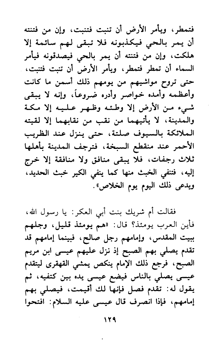 فتمطر، ويأمر الأرض أن تنبت فتنبت، وإن من فتنته أن يمر بالحي فيكذبونه فلا تبقى لهم سائمة إلا هلكت، وإن من فتنته أن يمر بالحي فيصدقونه فيأمر السماء أن تمطر فتمطر، ويأمر الأرض أن تنبت فتنبت، حتى تروح مواشيهم من يومهم ذلك أسمن ما كانت وأعظمه وأمده خواصر وأدره ضروعاً، وإنه لا يبقى شيء من الأرض إلا وطئه وظهر عليه إلا مكة والمدينة، لا يأتيهما من نقب من نقابهما إلا لقيته الملائكة بالسيوف صلتة، حتى ينزل عند الظريب الأحمر عند منقطع السبخة، فترجف المدينة بأهلها ثلاث رجفات، فلا يبقى منافق ولا منافقة إلا خرج إليه، فتنفي الخبث منها كما ينفي الكير خبث الحديد، ويدعى ذلك اليوم يوم الخلاص)) ، فقالت أم شريك بنت أبي العكر: يا رسول الله فأين العرب يومئذ؟ قال: ((هم يومئذ قليل، وجلهم ببيت المقدس، وإمامهم رجل صالح، فبينما إمامهم قد تقدم يصلي بهم الصبح إذ نزل عليهم عيسى ابن مريم الصبح، فرجع ذلك الإمام ينكص يمشي القهقرى ليتقدم عيسى يصلي بالناس فيضع عيسى يده بين كتفيه، ثم يقول له: تقدم فصل فإنها لك أقيمت، فيصلي بهم إمامهم، فإذا انصرف قال عيسى عليه السلام: افتحوا