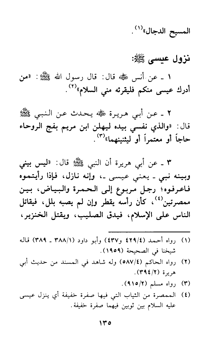 3- عن أبي هريرة أن النبي - صلى الله عليه وسلم - قال: ((ليس بيني وبينه نبي - يعني عيسى -، وإنه نازل، فإذا رأيتموه فاعرفوه؛ رجل مربوع إلى الحمرة والبياض، بين ممصرتين (¬4) ، كأن رأسه يقطر وإن لم يصبه بلل، فيقاتل الناس على الإسلام، فيدق الصليب، ويقتل الخنزير،