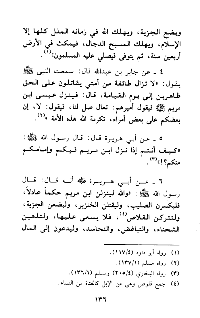 4- عن جابر بن عبد الله قال: سمعت النبي - صلى الله عليه وسلم - يقول: ((لا تزال طائفة من أمتي يقاتلون على الحق ظاهرين إلى يوم القيامة، قال: فينزل عيسى ابن مريم - صلى الله عليه وسلم - فيقول أميرهم: تعال صل لنا، فيقول: لا، إن بعضكم على بعض أمراء، تكرمة الله هذه الأمة)) (¬2) .