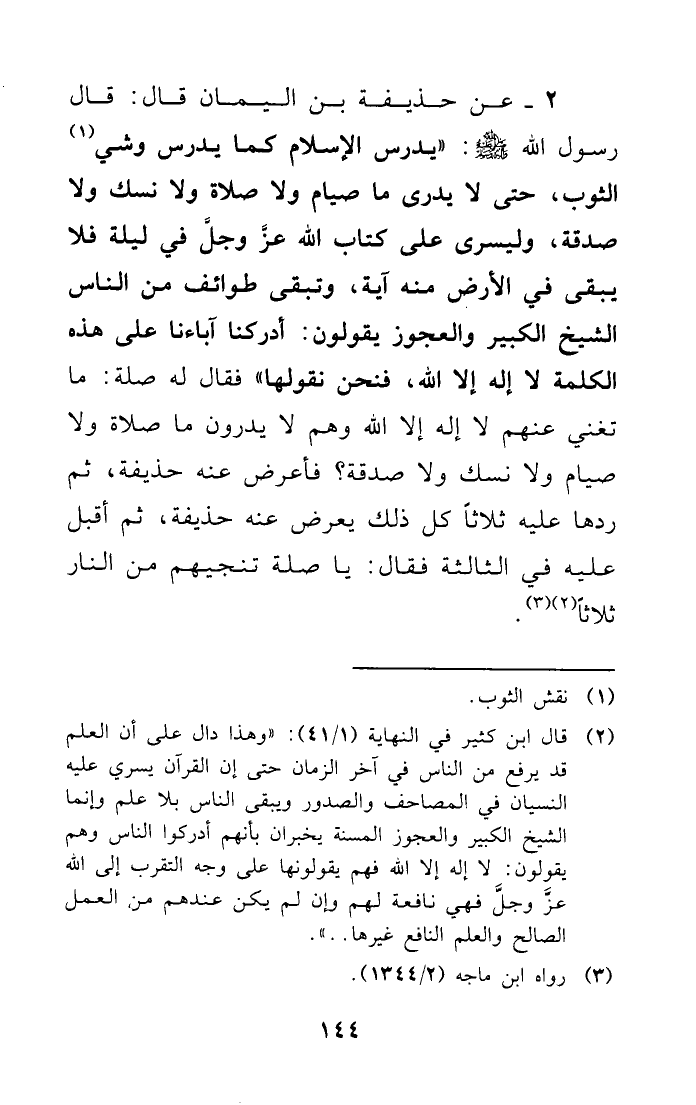 2- عن حذيفة بن اليمان قال: قال رسول الله - صلى الله عليه وسلم -: ((يدرس الإسلام كما يدرس وشي (¬1) الثوب، حتى لا يدرى ما صيام ولا صلاة ولا نسك ولا صدقة، وليسرى على كتاب الله عز وجل في ليلة فلا يبقى في الأرض منه آية، وتبقى طوائف من الناس الشيخ الكبير والعجوز يقولون: أدركنا آباءنا على هذه الكلمة لا إله إلا الله، فنحن نقولها)) فقال له صلة: ما تغني عنهم لا إله إلا الله وهم لا يدرون ما صلاة ولا صيام ولا نسك ولا صدقة؟ فأعرض عنه حذيفة، ثم ردها عليه ثلاثاً كل ذلك يعرض عنه حذيفة، ثم أقبل عليه في الثالثة فقال: يا صلة تنجيهم من النار ثلاثاً (¬2) . (¬3)