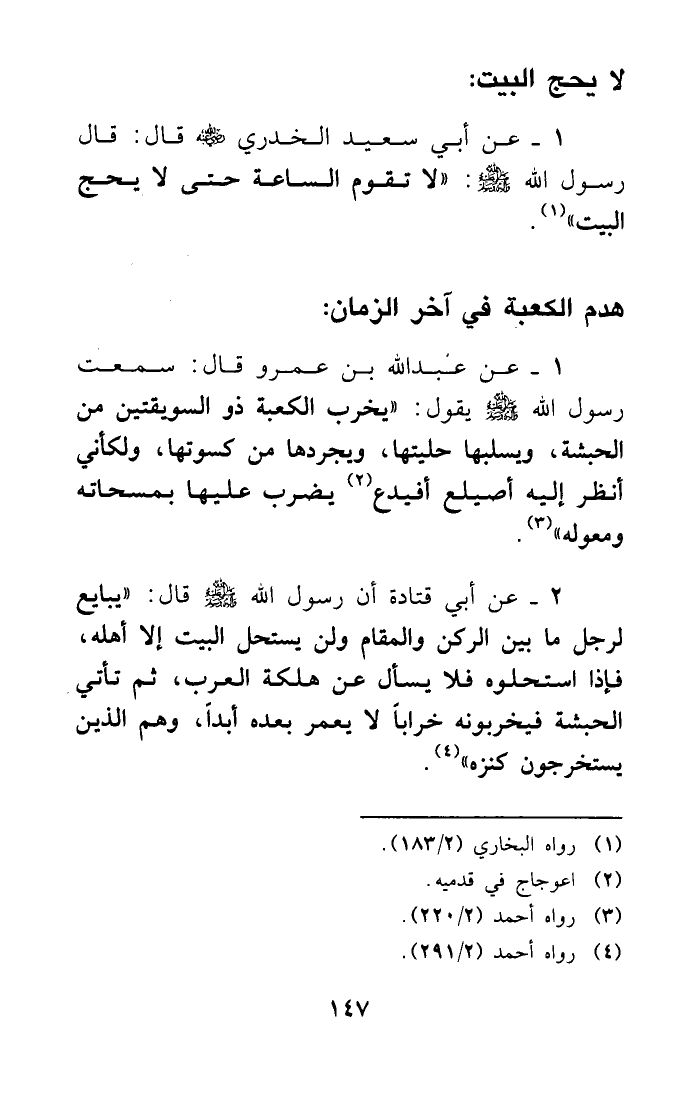 1- عن عبد الله بن عمرو قال: سمعت رسول الله - صلى الله عليه وسلم - يقول: يخرب الكعبة ذو السويقتين من الحبشة، ويسلبها حليتها، ويجردها من كسوتها، ولكأني أنظر إليه أصيلع أفيدع (¬2) يضرب عليها بمسحاته ومعوله)) (¬3) .