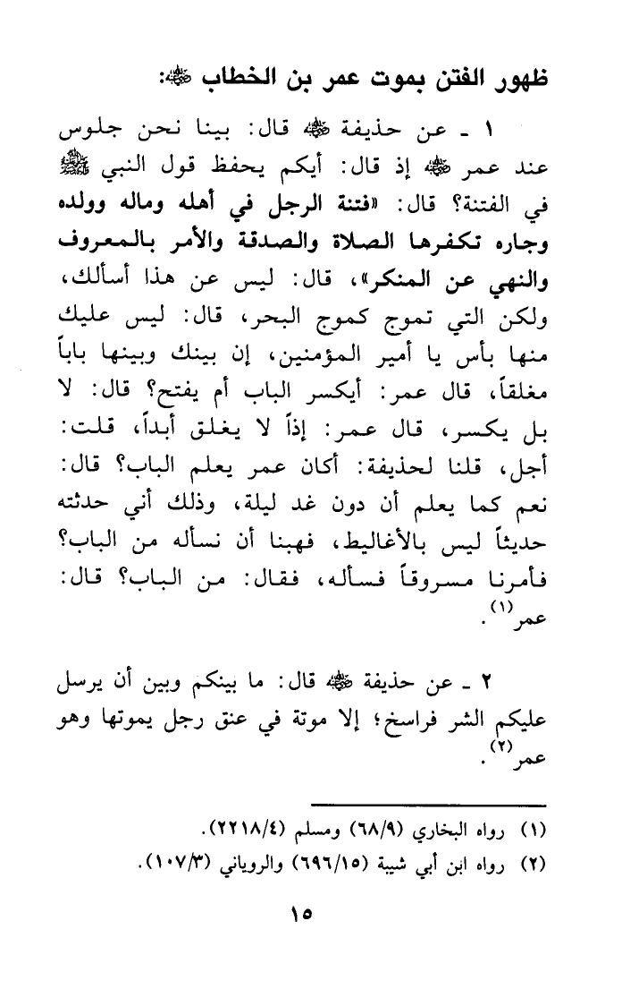 1- عن حذيفة - رضي الله عنه - قال: بينا نحن جلوس عند عمر - رضي الله عنه - إذ قال: أيكم يحفظ قول النبي - صلى الله عليه وسلم - في الفتنة؟ قال: فتنة الرجل في أهله وماله وولده وجاره تكفرها الصلاة والصدقة والأمر بالمعروف والنهي عن المنكر، قال: ليس عن هذا أسألك، ولكن التي تموج كموج البحر، قال: ليس عليك منها بأس يا أمير المؤمنين، إن بينك وبينها باباً مغلقاً، قال عمر: أيكسر الباب أم يفتح؟ قال: لا بل يكسر، قال عمر: إذاً لا يغلق أبداً، قلت: أجل، قلنا لحذيفة: أكان عمر يعلم الباب؟ قال: نعم كما يعلم أن دون غد ليلة، وذلك أني حدثته حديثاً ليس بالأغاليط، فهبنا أن نسأله من الباب؟ فأمرنا مسروقاً فسأله، فقال: من الباب؟ قال: عمر (¬1) .
