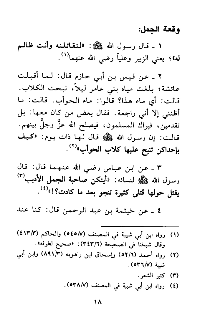 2- عن قيس بن أبي حازم قال: لما أقبلت عائشة؛ بلغت مياه بني عامر ليلاً، نبحت الكلاب. قالت: أي ماء هذا؟ قالوا: ماء الحوأب. قالت: ما أظنني إلا أني راجعة. فقال بعض من كان معها: بل تقدمين، فيراك المسلمون، فيصلح الله عز وجل بينهم. قالت: إن رسول الله - صلى الله عليه وسلم - قال لها ذات يوم: ((كيف بإحداكن تنبح عليها كلاب الحوأب)) (¬2) .