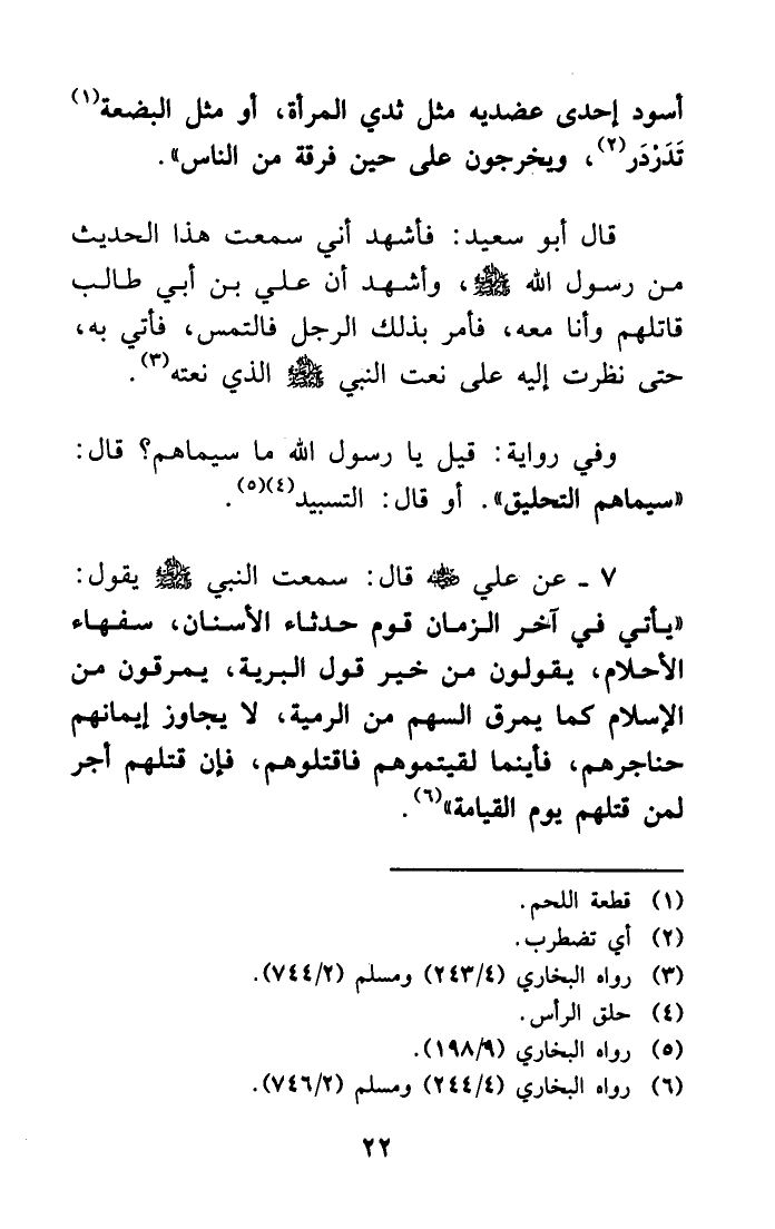 7- عن علي - رضي الله عنه - قال: سمعت النبي - صلى الله عليه وسلم - يقول: ((يأتي في آخر الزمان قوم حدثاء الأسنان، سفهاء الأحلام، يقولون من خير قول البرية، يمرقون من الإسلام كما يمرق السهم من الرمية، لا يجاوز إيمانهم حناجرهم، فأينما لقيتموهم فاقتلوهم، فإن قتلهم أجر لمن قتلهم يوم القيامة)) (¬6) .
