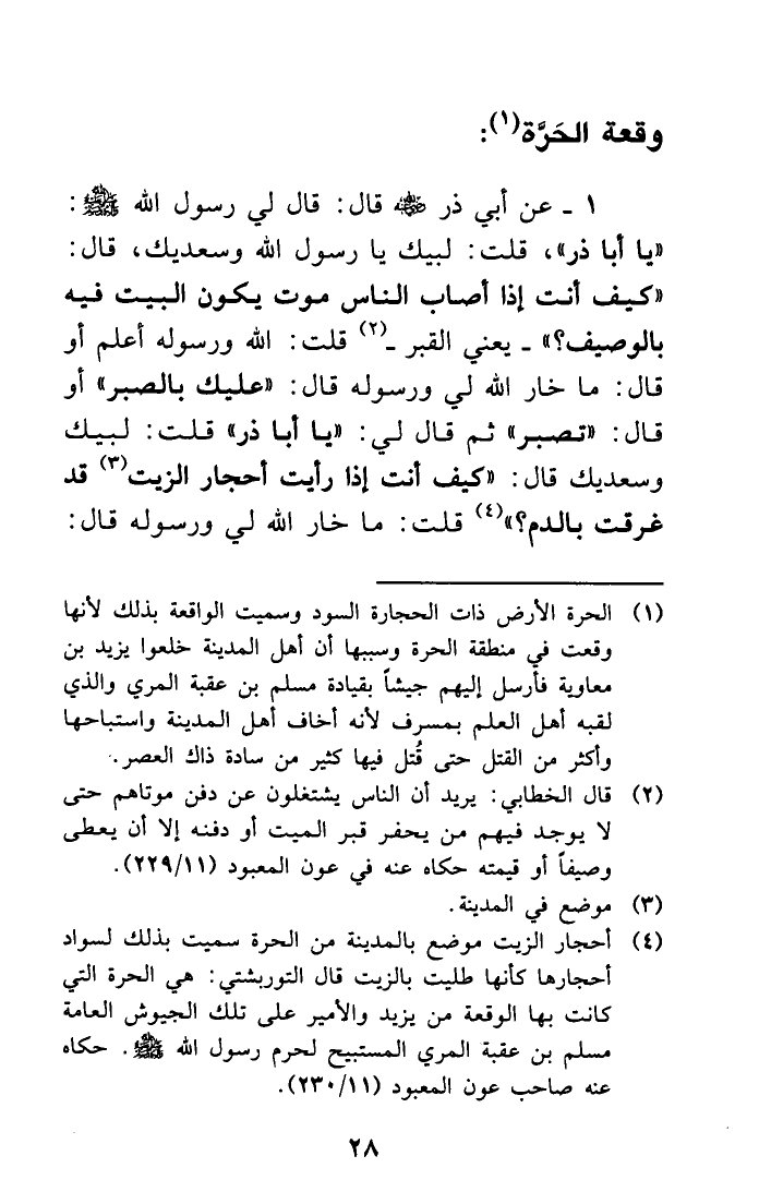 (¬1) الحرة الأرض ذات الحجارة السود وسميت الواقعة بذلك لأنها وقعت في منطقة الحرة وسببها أن أهل المدينة خلعوا يزيد بن معاوية فأرسل إليهم جيشاً بقيادة مسلم بن عقبة المري والذي لقبه أهل العلم بمسرف لأنه أخاف أهل المدينة واستباحها وأكثر من القتل حتى قُتل فيها كثير من سادة ذاك العصر.