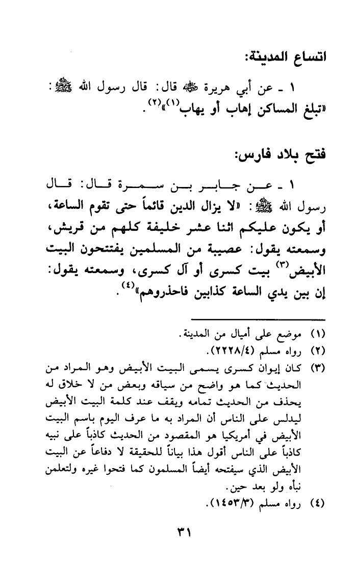 (¬3) كان إيوان كسرى يسمى البيت الأبيض وهو المراد من الحديث كما هو واضح من سياقه وبعض من لا خلاق له يحذف من الحديث تمامه ويقف عند كلمة البيت الأبيض ليدلس على الناس أن المراد به ما عرف اليوم باسم البيت الأبيض في أمريكيا هو المقصود من الحديث كاذباً على نبيه كاذباً على الناس أقول هذا بياناً للحقيقة لا دفاعاً عن البيت الأبيض الذي سيفتحه أيضاً المسلمون كما فتحوا غيره ولتعلمن نبأه ولو بعد حين.