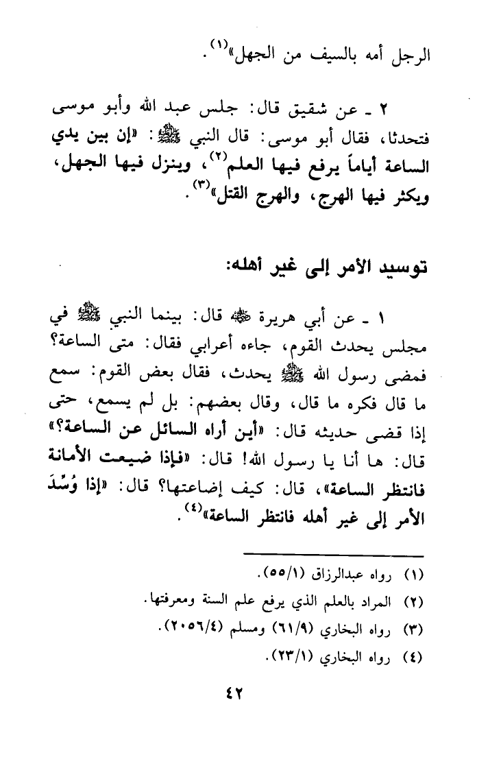 1- عن أبي هريرة - رضي الله عنه - قال: بينما النبي - صلى الله عليه وسلم - في مجلس يحدث القوم، جاءه أعرابي فقال: متى الساعة؟ فمضى رسول الله - صلى الله عليه وسلم - يحدث، فقال بعض القوم: سمع ما قال فكره ما قال، وقال بعضهم: بل لم يسمع، حتى إذا قضى حديثه قال: ((أين أراه السائل عن الساعة؟)) قال: ها أنا يا رسول الله! قال: ((فإذا ضيعت الأمانة فانتظر الساعة)) ، قال: كيف إضاعتها؟ قال: ((إذا وُسِّدَ الأمر إلى غير أهله فانتظر الساعة)) (¬4) .
