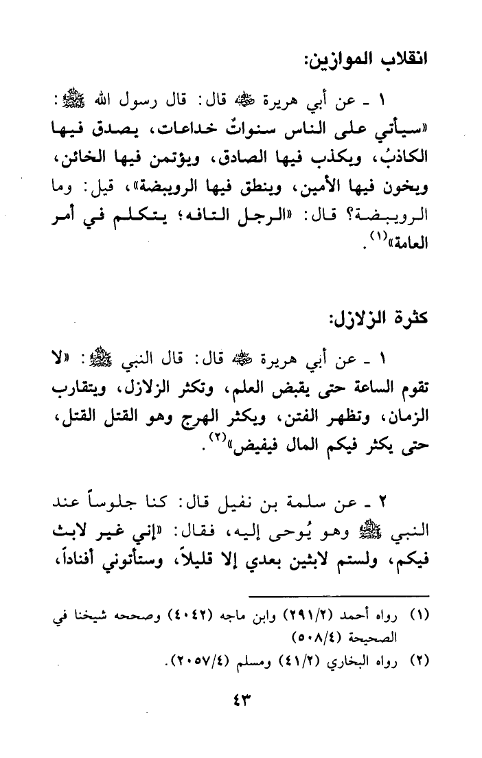 1-عن أبي هريرة - رضي الله عنه - قال: قال رسول الله - صلى الله عليه وسلم -: ((سيأتي على الناس سنواتٌ خداعات، يصدق فيها الكاذبُ، ويكذب فيها الصادق، ويؤتمن فيها الخائن، ويخون فيها الأمين، وينطق فيها الرويبضة)) ، قيل: وما الرويبضة؟ قال: ((الرجل التافه؛ يتكلم في أمر العامة)) (¬1) .