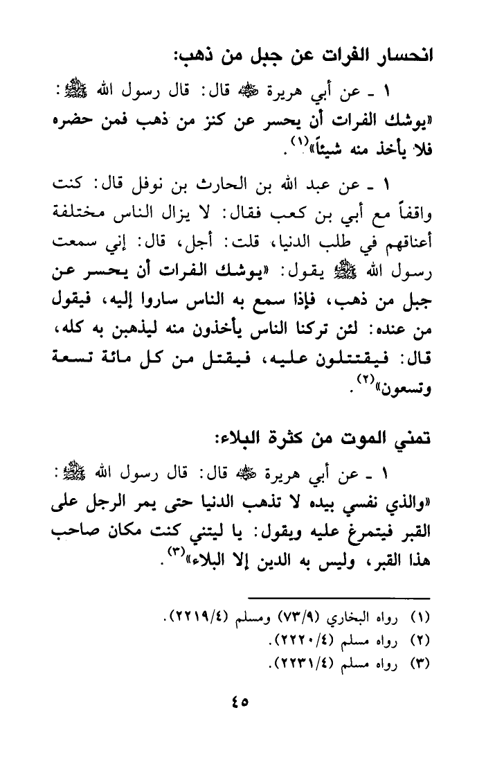1- عن أبي هريرة - رضي الله عنه - قال: قال رسول الله - صلى الله عليه وسلم -: ((يوشك الفرات أن يحسر عن كنز من ذهب فمن حضره فلا يأخذ منه شيئاً)) (¬1) .