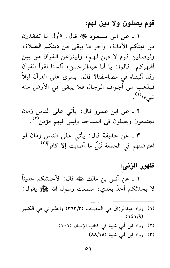 1- عن ابن مسعود - رضي الله عنه - قال: ((أول ما تفقدون من دينكم الأمانة، وآخر ما يبقى من دينكم الصلاة، وليصلين قوم لا دين لهم، ولينزعن القرآن من بين أظهركم. قالوا: يا أبا عبد الرحمن ألسنا نقرأ القرآن وقد أثبتناه في مصاحفنا؟ قال: يسرى على القرآن ليلاً فيذهب من أجواف الرجال فلا يبقى في الأرض منه شيء)) (¬1) .