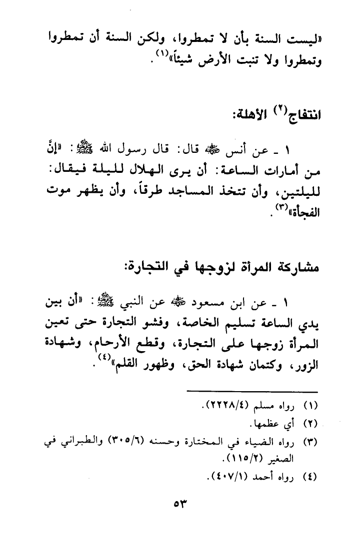 1- عن أنس - رضي الله عنه - قال: قال رسول الله - صلى الله عليه وسلم -: ((إنَّ من أمارات الساعة: أن يرى الهلال لليلة فيقال: لليلتين، وأن تتخذ المساجد طرقاً، وأن يظهر موت الفجأة)) (¬3) .