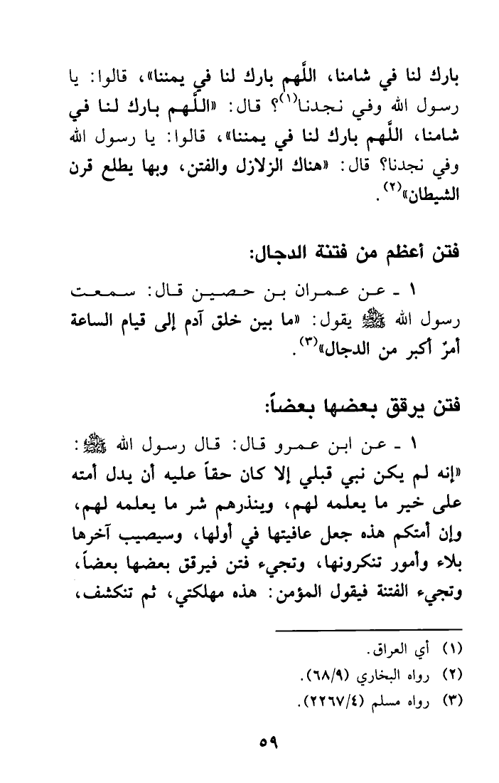 بارك لنا في شامنا، اللهم بارك لنا في يمننا)) ، قالوا: يا رسول الله وفي نجدنا (¬1) ؟ قال: ((اللهم بارك لنا في شامنا، اللهم بارك لنا في يمننا)) ، قالوا: يا رسول الله وفي نجدنا؟ قال: ((هناك الزلازل والفتن، وبها يطلع قرن الشيطان)) (¬2) .