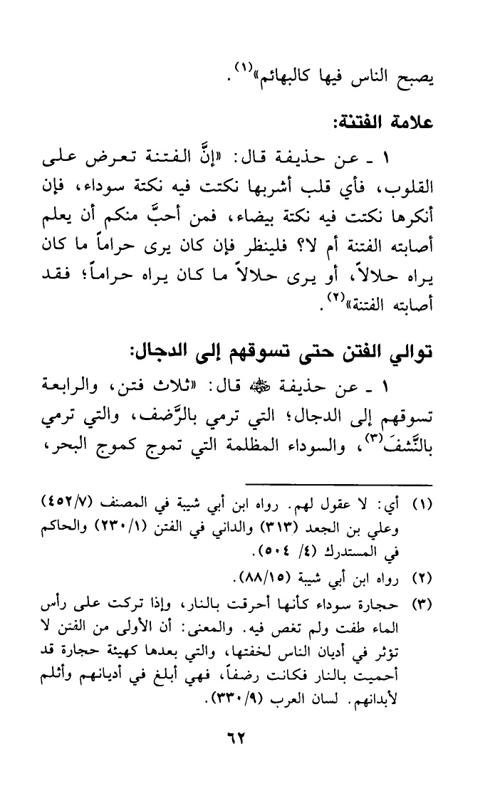 1- عن حذيفة - رضي الله عنه - قال:: ((ثلاث فتن، والرابعة تسوقهم إلى الدجال؛ التي ترمي بالرَّضف، والتي ترمي بالنَّشفَ (¬3) ، والسوداء المظلمة التي تموج كموج البحر،