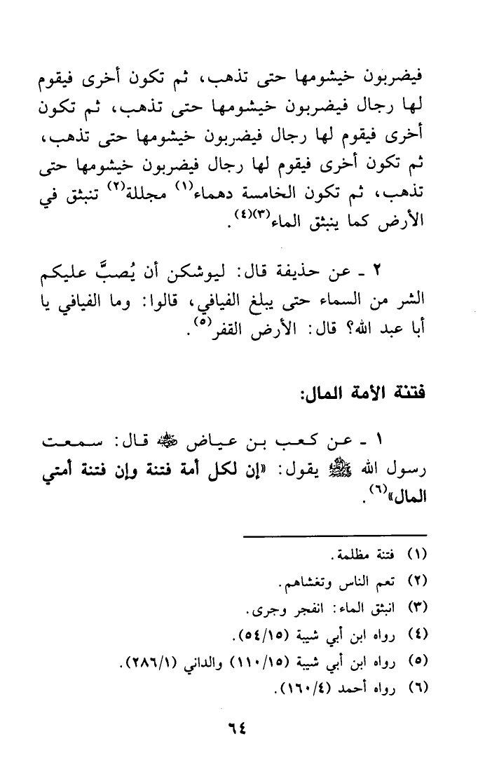 1- عن كعب بن عياض - رضي الله عنه - قال: سمعت رسول الله - صلى الله عليه وسلم - يقول: ((إن لكل أمة فتنة وإن فتنة أمتي المال)) (¬6) .