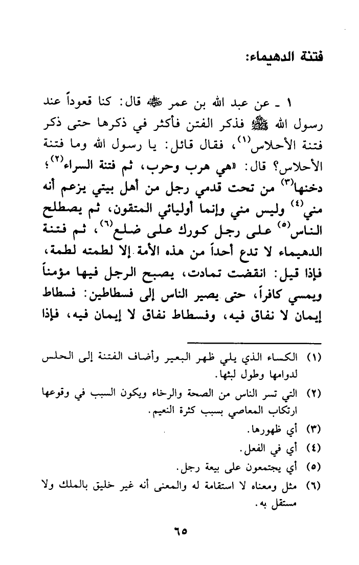 1-عن عبد الله بن عمر - رضي الله عنه - قال: كنا قعوداً عند رسول الله - صلى الله عليه وسلم - فذكر الفتن فأكثر في ذكرها حتى ذكر فتنة الأحلاس (¬1) ، فقال قائل: يا رسول الله وما فتنة الأحلاس؟ قال: ((هي هرب وحرب، ثم فتنة السراء (¬2) ؛ دخنها (¬3) من تحت قدمي رجل من أهل بيتي يزعم أنه مني (¬4) وليس مني وإنما أوليائي المتقون، ثم يصطلح الناس (¬5) على رجل كورك على ضلع (¬6) ، ثم فتنة الدهيماء لا تدع أحداً من هذه الأمة إلا لطمته لطمة، فإذا قيل: انقضت تمادت، يصبح الرجل فيها مؤمناً ويمسي كافراً، حتى يصير الناس إلى فسطاطين: فسطاط إيمان لا نفاق فيه، وفسطاط نفاق لا إيمان فيه، فإذا
