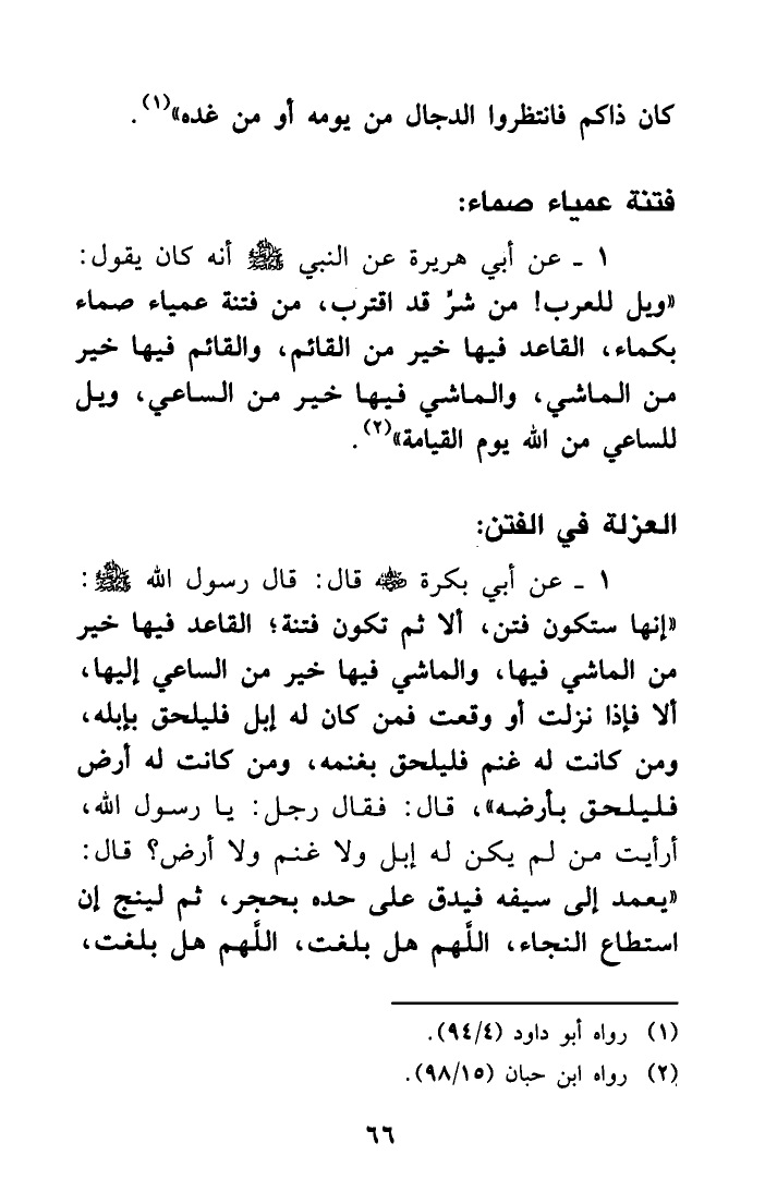 1- عن أبي بكرة - رضي الله عنه - قال: قال رسول الله - صلى الله عليه وسلم -: ((إنها ستكون فتن، ألا ثم تكون فتنة؛ القاعد فيها خير من الماشي فيها، والماشي فيها خير من الساعي إليها، ألا فإذا نزلت أو وقعت فمن كان له إبل فليلحق بإبله، ومن كانت له غنم فليلحق بغنمه، ومن كانت له أرض فليلحق بأرضه، قال: فقال رجل: يا رسول الله أرأيت من لم يكن له إبل ولا غنم ولا أرض؟ قال: يعمد إلى سيفه فيدق على حده بحجر، ثم لينج إن استطاع النجاء، اللهم هل بلغت، اللهم هل بلغت،
