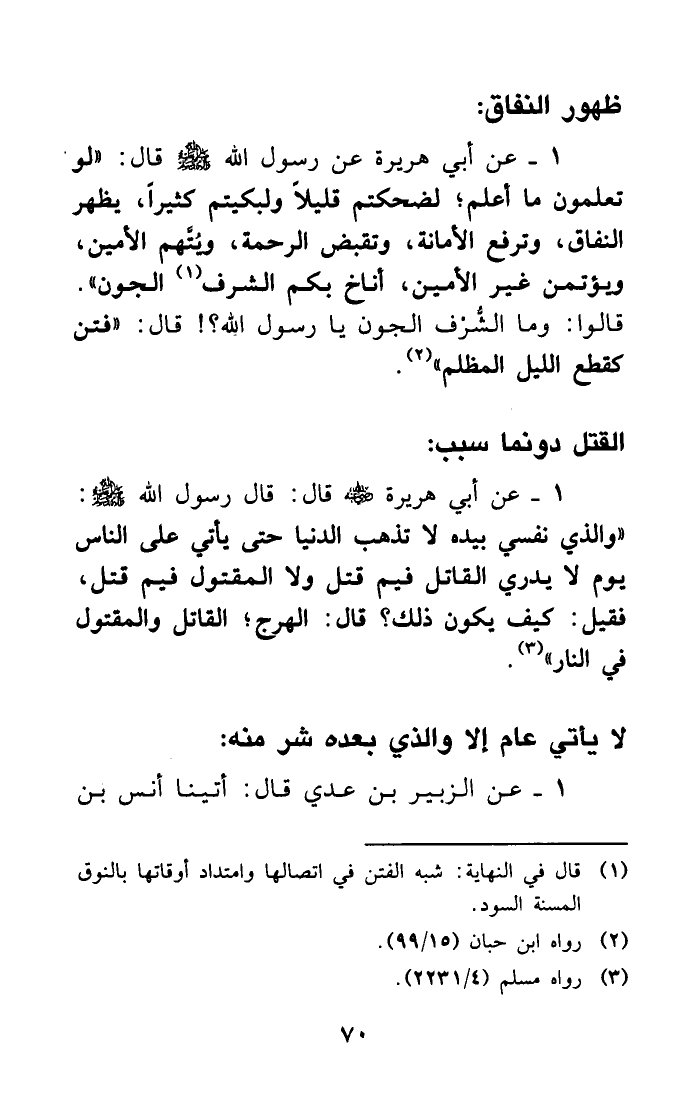 1- عن أبي هريرة عن رسول الله - صلى الله عليه وسلم - قال: ((لو تعلمون ما أعلم؛ لضحكتم قليلاً ولبكيتم كثيراً، يظهر النفاق، وترفع الأمانة، وتقبض الرحمة، ويُتَّهم الأمين، ويؤتمن غير الأمين، أناخ بكم الشرف (¬1) الجون)) . قالوا: وما الشُّرْف الجون يا رسول الله؟! قال: ((فتن كقطع الليل المظلم)) (¬2) .